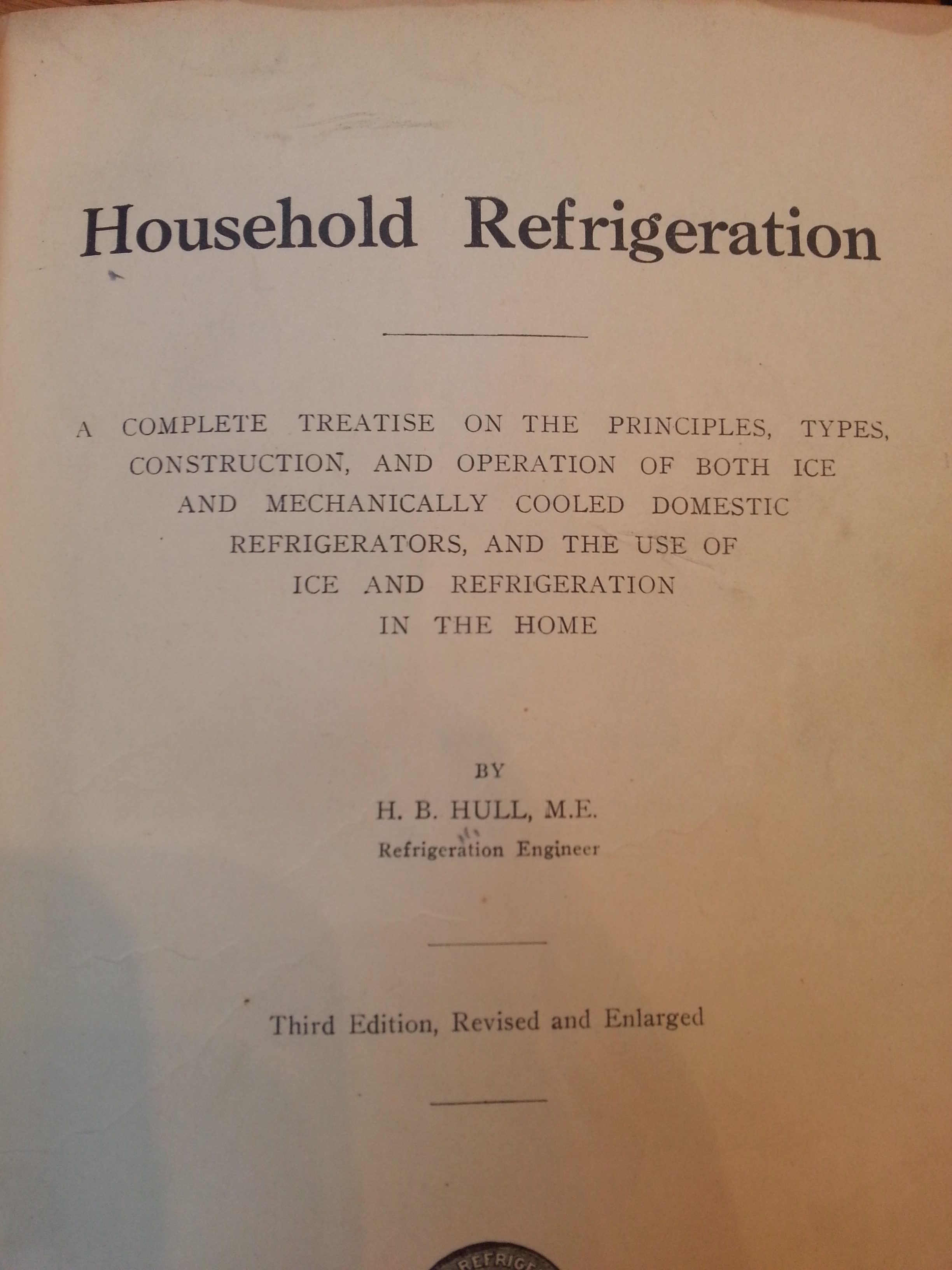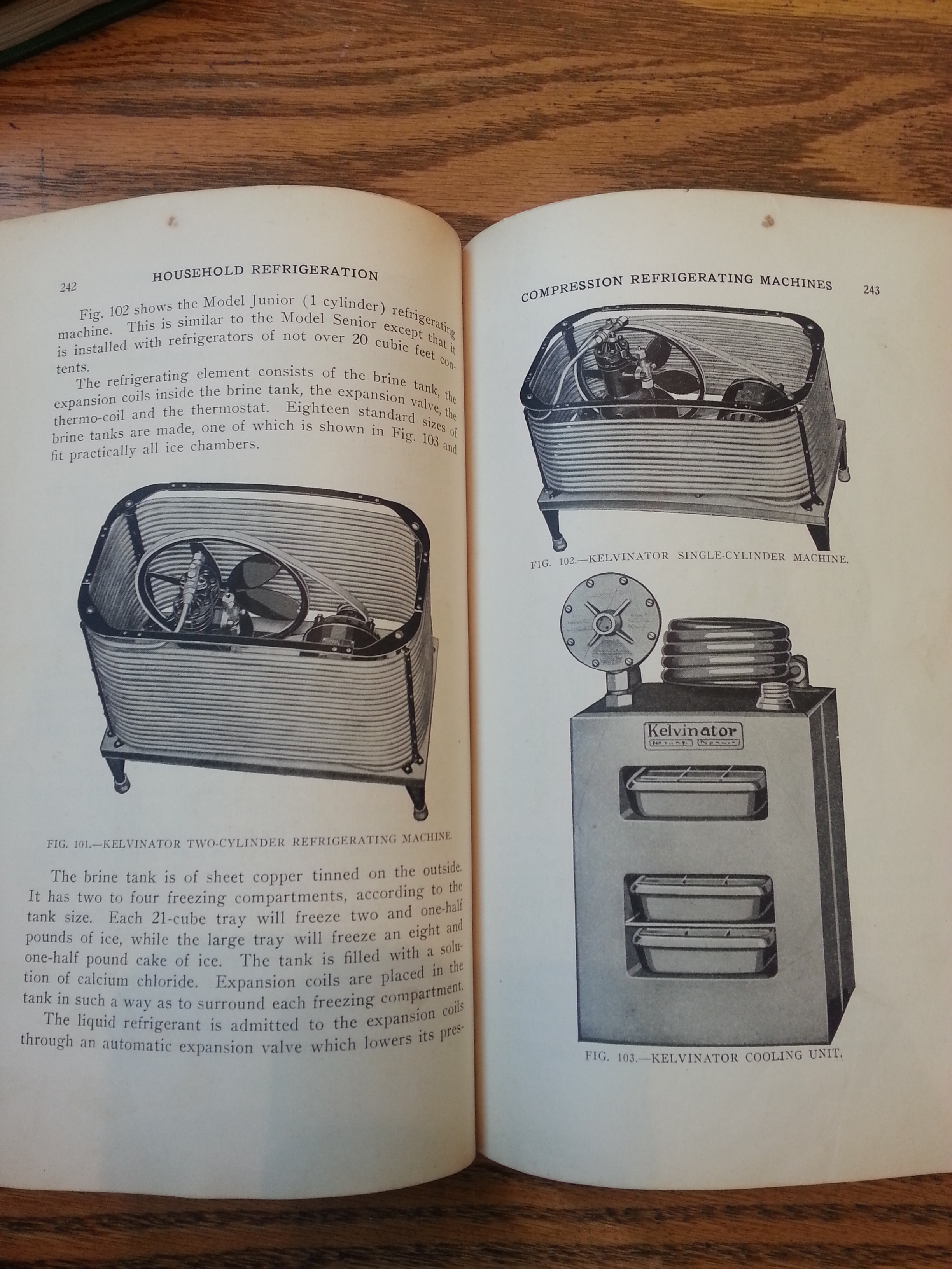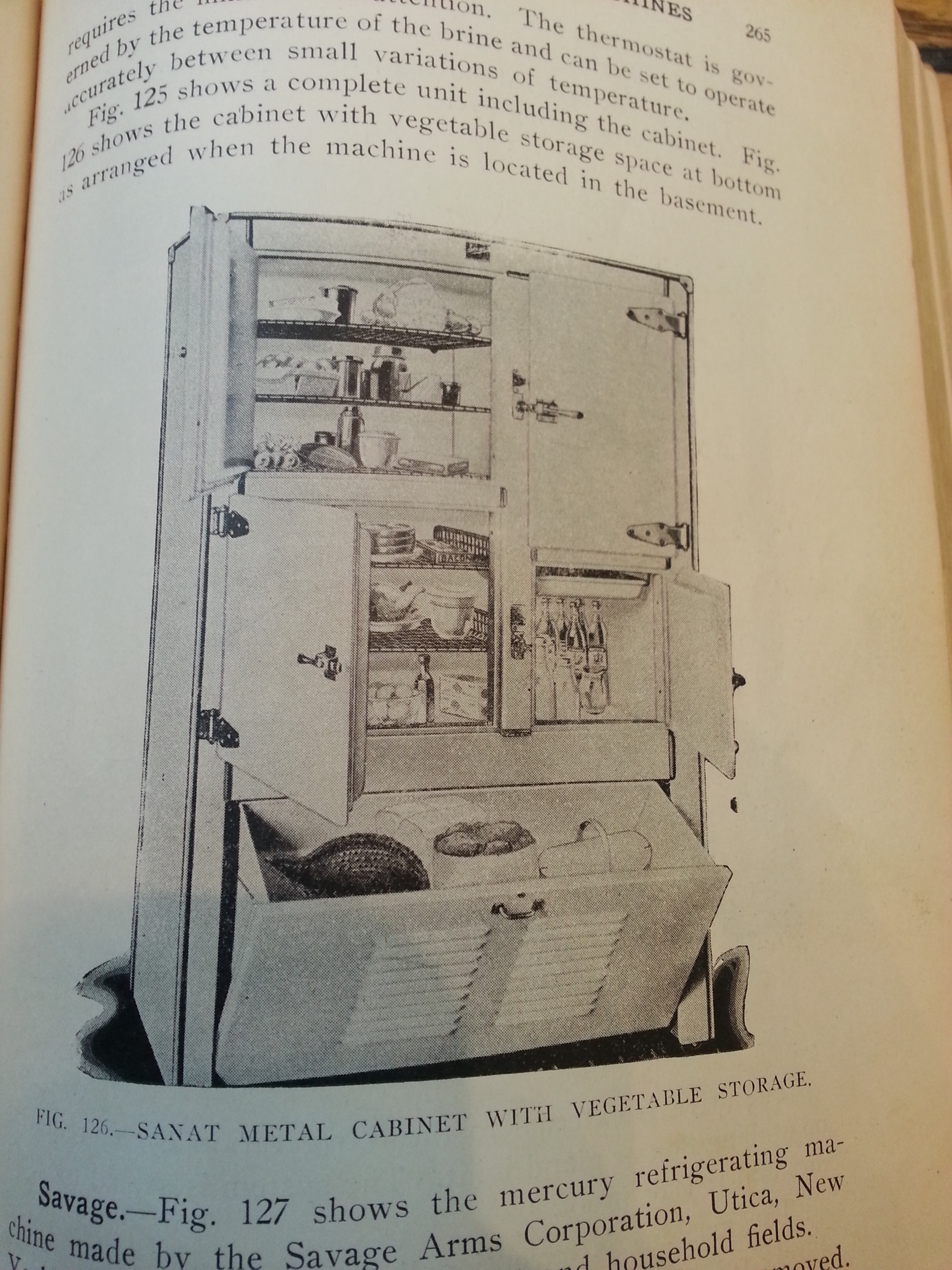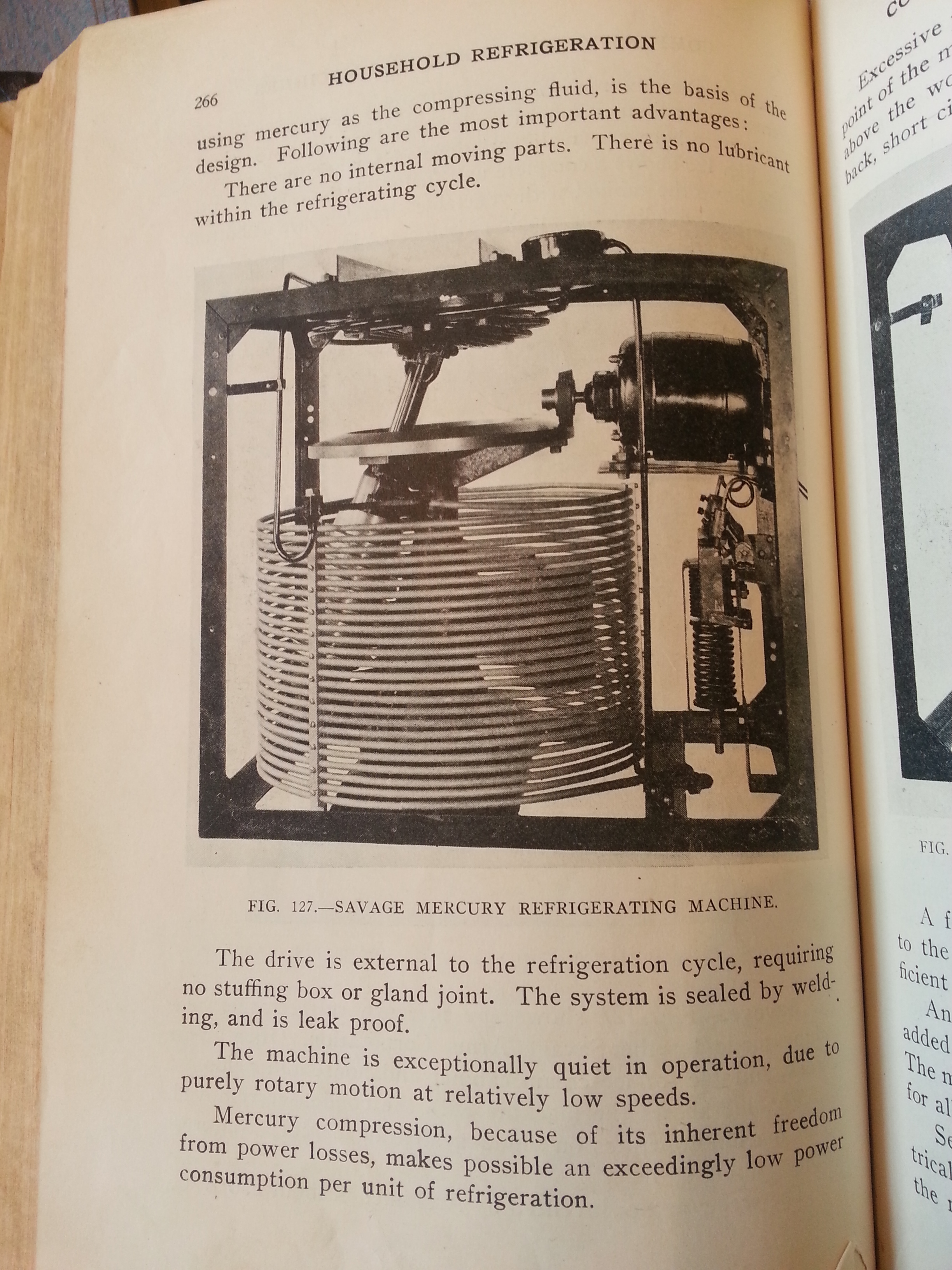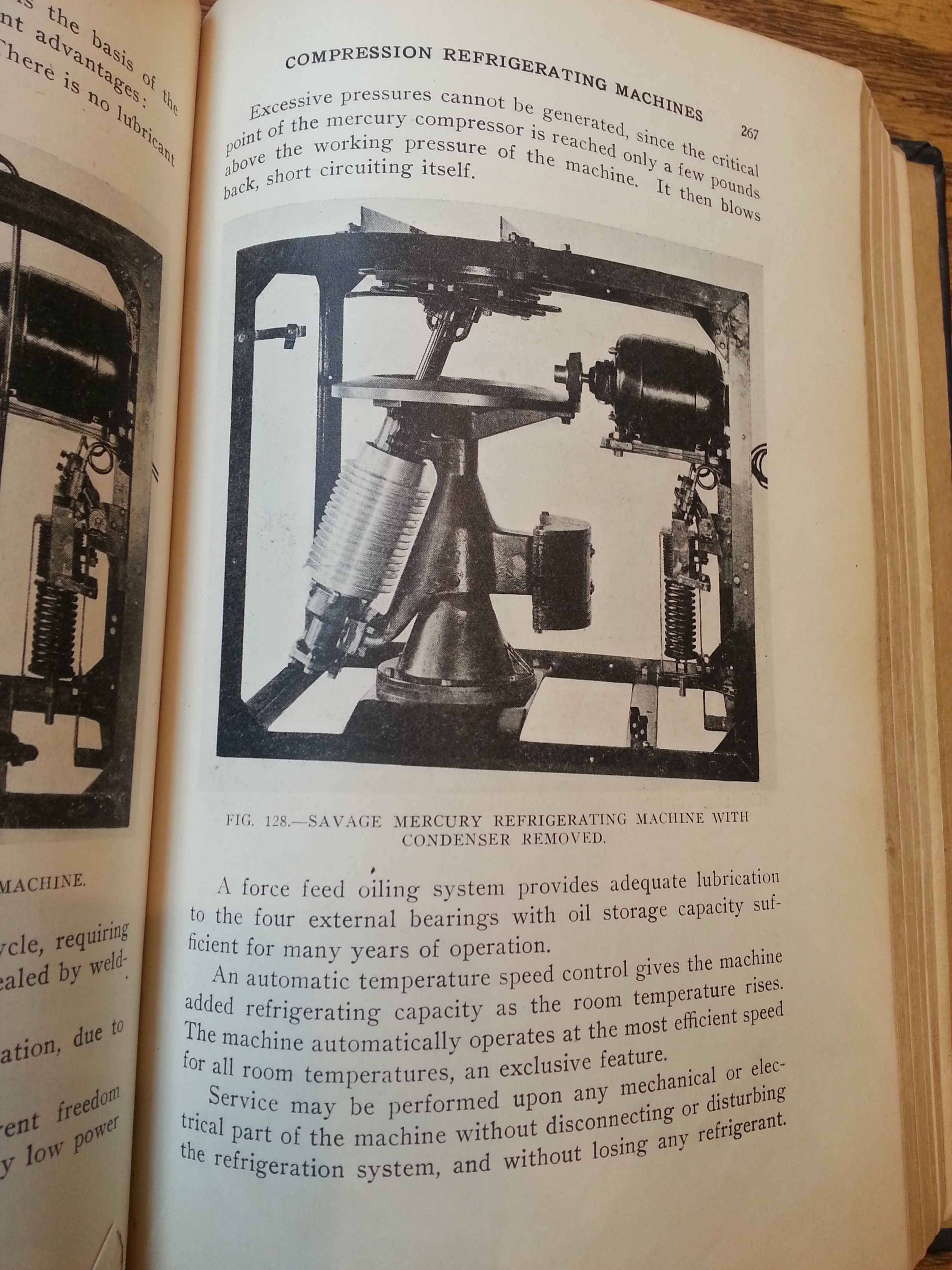 Notice the individual cabinet like doors on the refrigerator and the swinging drawer at bottom. Most units were belt driven external drive in this book. There was extensive use of flooded evaporators with low side floats at this time. I bought two editions of this book. I hope to get them scanned into pdf and share. Also of note, a late 20’s book on Ice Manufacture and the use of Cork Insulation. 3 Pictures describe and show the Savage mercury compressor; an oddity I’ve seen little of before.