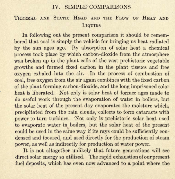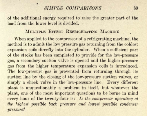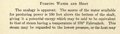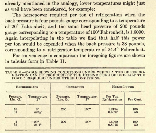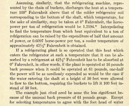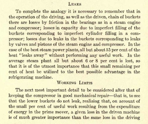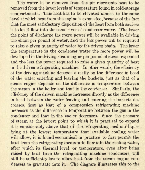 The following are several pages taken from the above mentioned book. A similar explanation is more or less copied in “Power’s Principles of Refrigeration” of which I have a 1921 copy. Take special note of the beautiful illustration below. Clicking on it should provide a larger version. I’ve seen outlines comparing mechanical refrigeration to water pumps in the sense that they both require work to lift, pump or otherwise increase a potential, but never to the great painstaking detail as is laid out in the following pages.