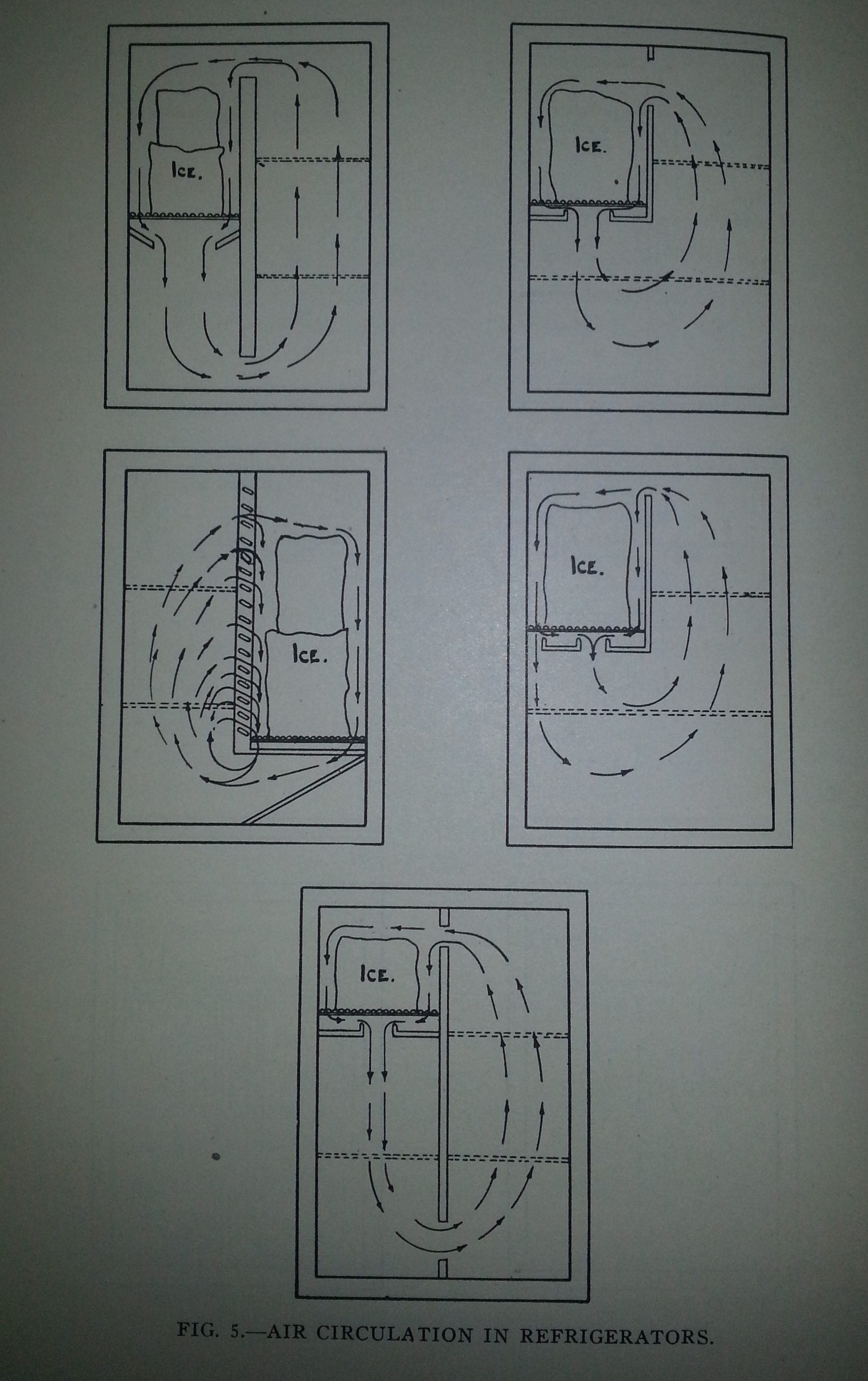 air-circulation-in-refrigeratorSo, it should be no surprise that once vapor compression and absorption refrigeration became popular, that the ice block was replaced by the evaporator and this method of natural convective cooling continued on for many years.  As freezer/refrigerator combos became available, so with it was the need to regularly defrost the freezer because of the accumulation of condensation on the evaporator coil resulting in longer compressor runtimes and higher cabinet temperatures.  Many units today now have automatic defrost and/or two separate evaporator coils keeping the moisture in the refrigerated cabinet from condensing on the freezer coil.  Also the of circulating fans today allow for many different cabinet designs including the freezer on bottom and the side by side.  Fans require electricity and are often cheap, inefficient shaded pole motors.