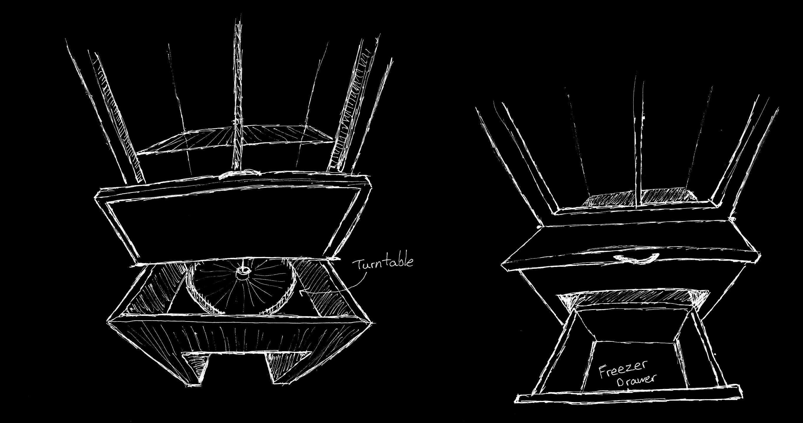 Turnatable-and-Freezer-DrawerThe back part of this lower space is not easily accessible from the opening at the lid, but could be with the use of a turntable.  The corner space unused by the turntable could be solid insulation or pockets for other commonly used items.  These two volumes, the lower and upper, could be partitioned from one another so as to maintain overall better temperature.  The drawing to the right shows what this design might look like with a freezer drawer.