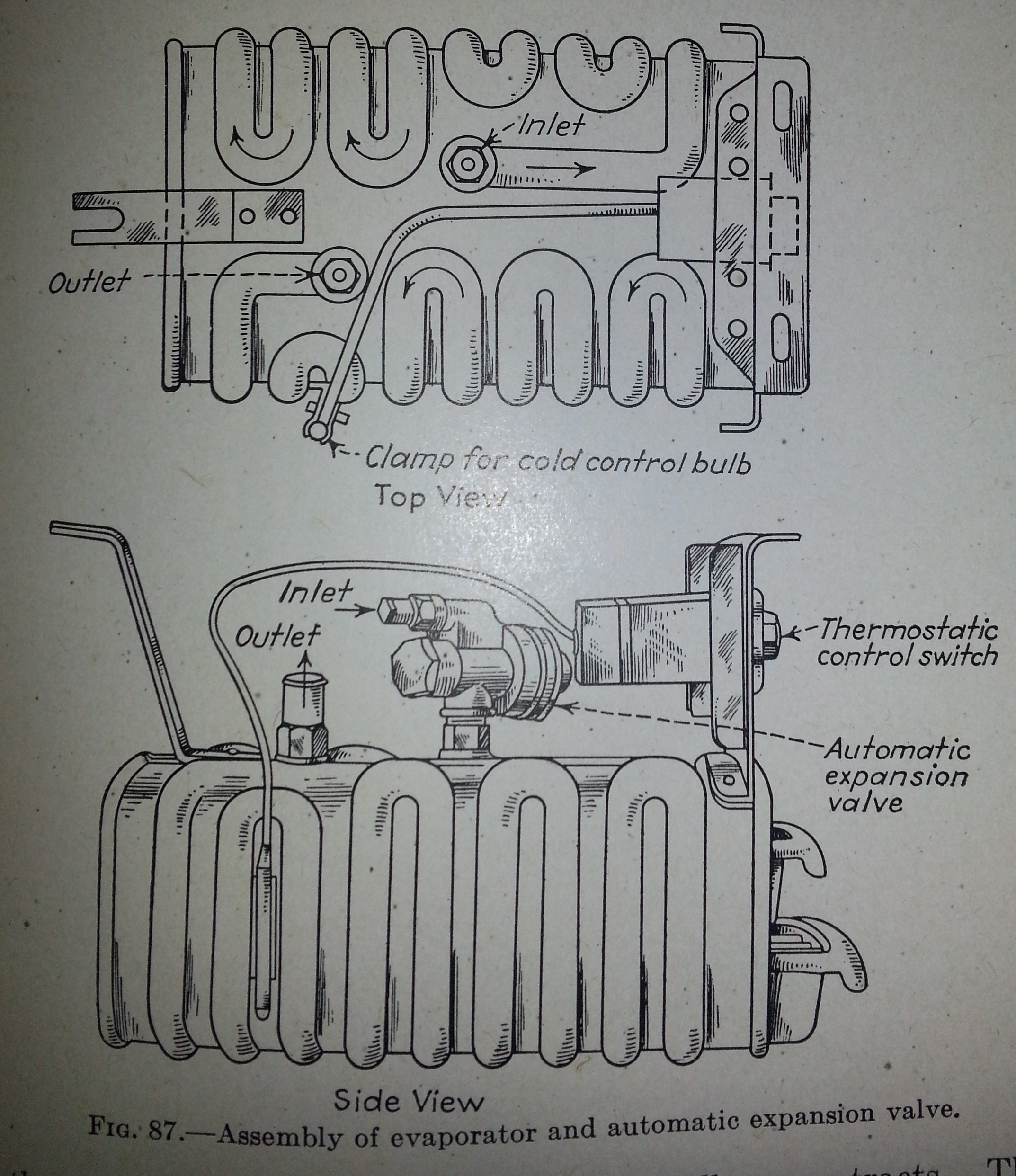 A very simple dry type evaporator with and AXV. Notice the Thermostatic Control Switch. This has nothing to do with the refrigerant supply, but simply controls the electrical current to the compressor and allows the operator to adjust the cabinet temperature. These worked with a thermostatic bulb strapped to the evaporator, suction line or somewhere else in the cabinet. The Thermostat was a great improvement over the controls of the 20s which sometimes used a pressure operated switch tied into the suction line. The service or replacement of these complicated switches could involved breaking the sealed refrigerant line.