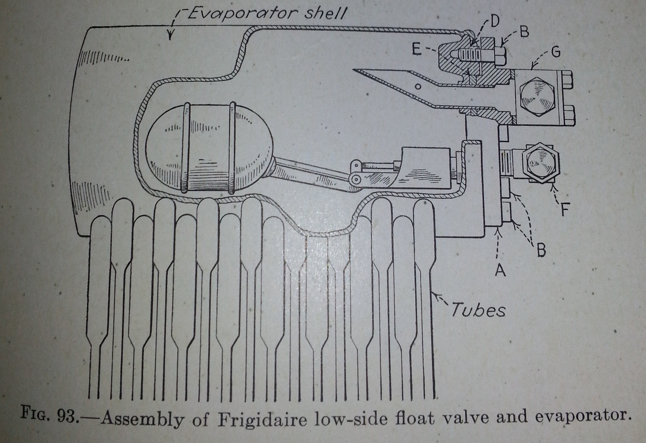 Above, is one of these low side float assemblies. These seemed to be falling out of favor by the mid 1930s for various reason having to do with expense and reliability. The float valve simply regulated the volume of liquid refrigerant within the evaporator shell which was maintained at suction pressure. As the refrigerant boiled away and was carried to the compressor, the ball would drop, valve open and additional high pressure liquid would be admitted. When implemented properly, the low side float gravity flooded evaporator has many advantages over the high side float or the dry type evaporator. It was very important that these machines were properly leveled when installed. They definitely had a minimum charge volume below which the float valve would continually call for more refrigerant and when it was not available, the valve would remain open, leaving very little pressure drop between the high and low side resulting in little to no refrigerating effect. A large refrigerant charge could simply be handled with a sufficiently sized liquid receiver. (Also read The Great Gravity Flooded Evaporator)
