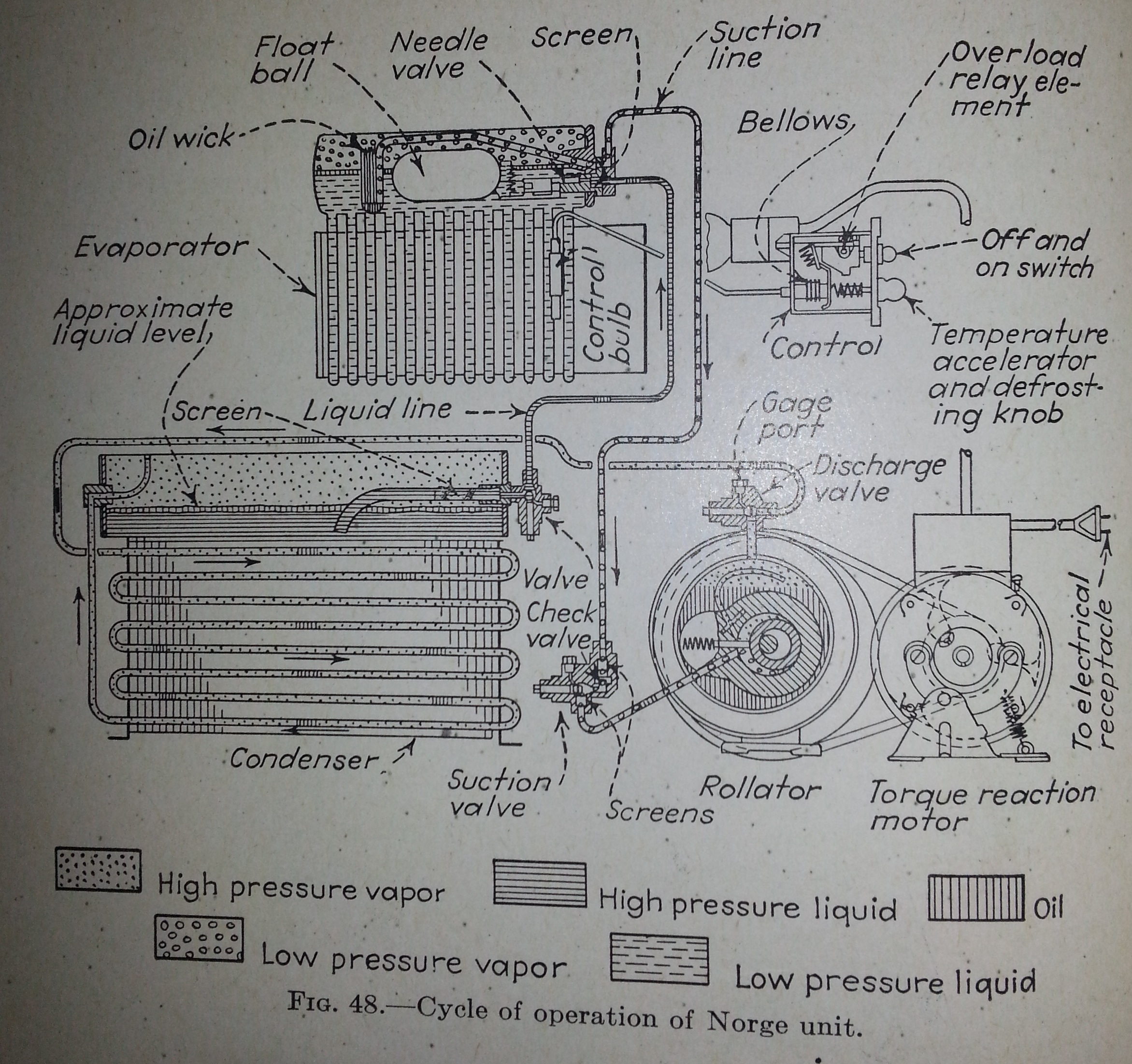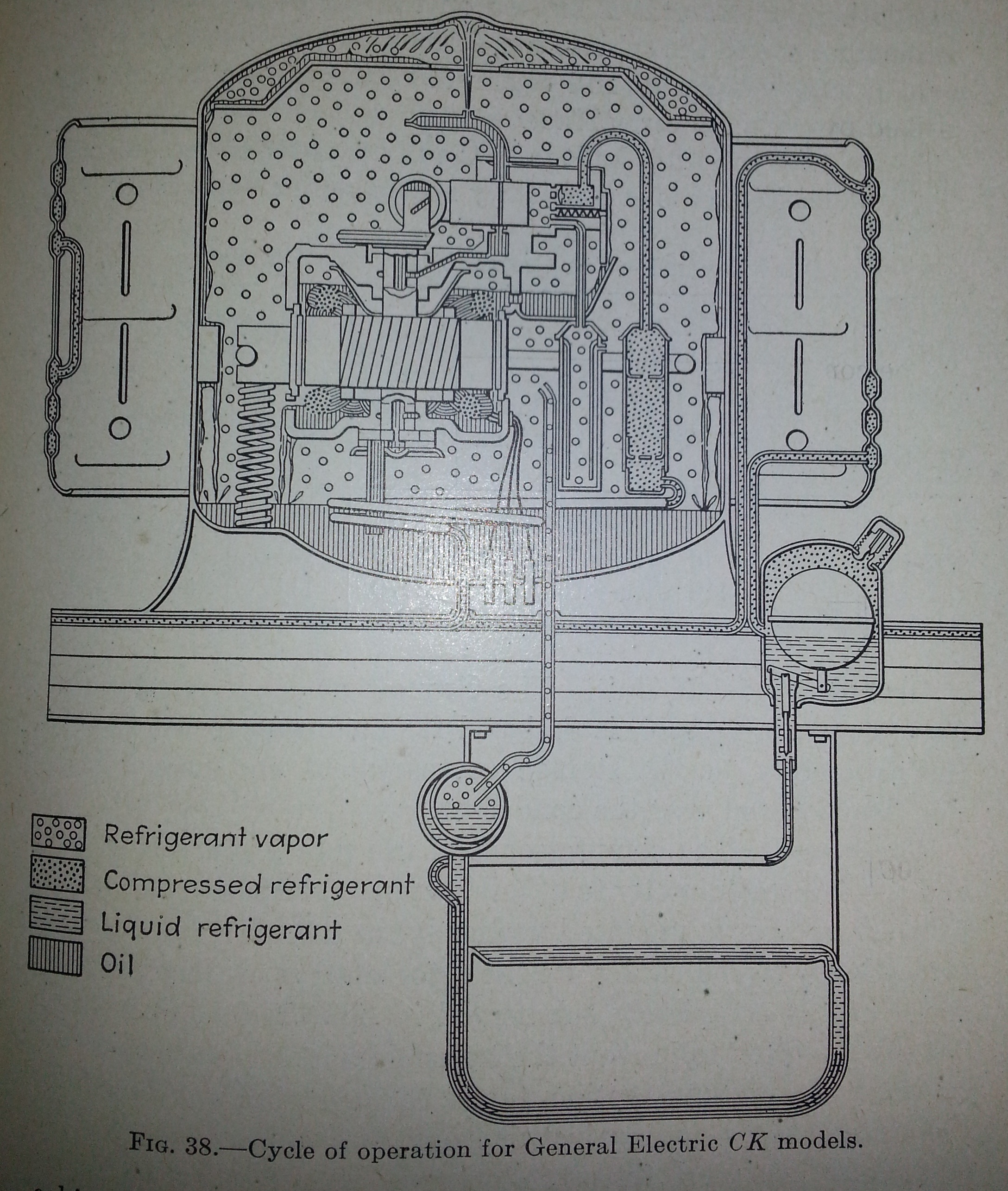 From the same 1933 book, this Electrolux diagram has some neat features. It’s an open drive reciprocating compressor probably with a fan cooled condenser. Most domestic units were fan cooled by this time. Early in the 20s, the higher head pressures associated with atmospheric condensers made water cooled condensers more common. WIth the addition of condenser cooling fins and the increased air flow from fans tied to higher speed electric motors, air cooling became more practical. This unit has a curious evaporator. All though it has a low side float, the evaporator coil is one continuous loop like a dry type evaporator. This could lead to vapor pockets forming and elevated pressures over the suction pressure, decreasing the rate of ebullition. Another interesting feature being the extra loop or two in the suction line to vaporize any liquid refrigerant in the suction line.