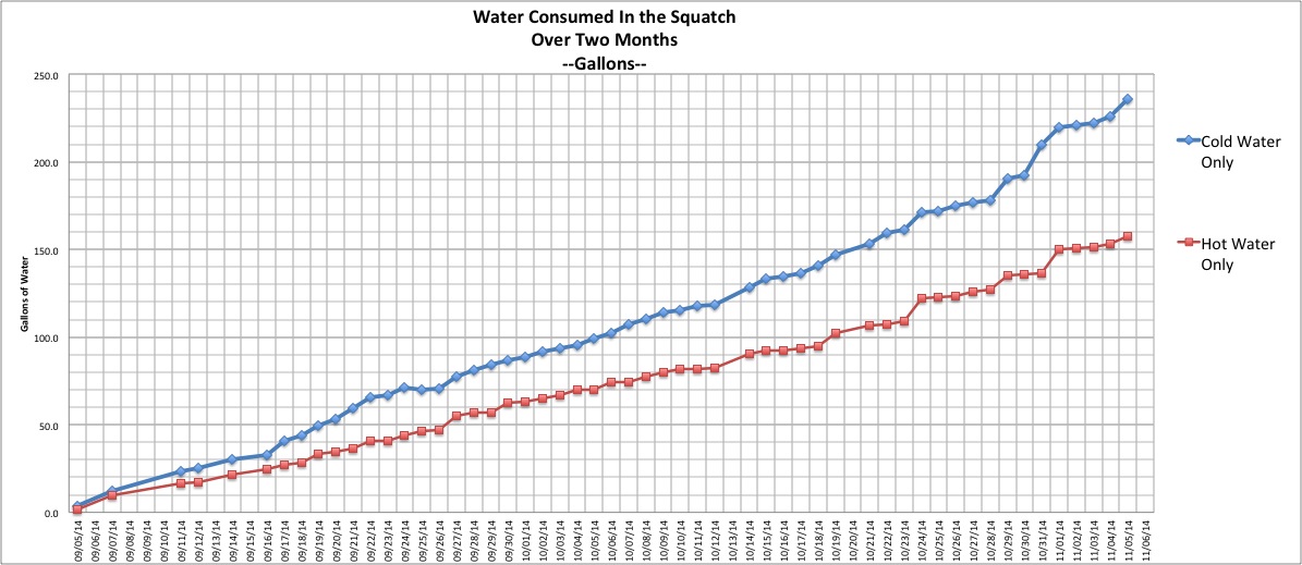 Above, you can see the water readings over these two months.  There are a few days that I forgot to take readings, but it is complete or the most part.  There is a notable spike in use on Halloween.  That would be the day my cats attacked the plumbing system and wasted a ton of water.  I’ll explain that next time.