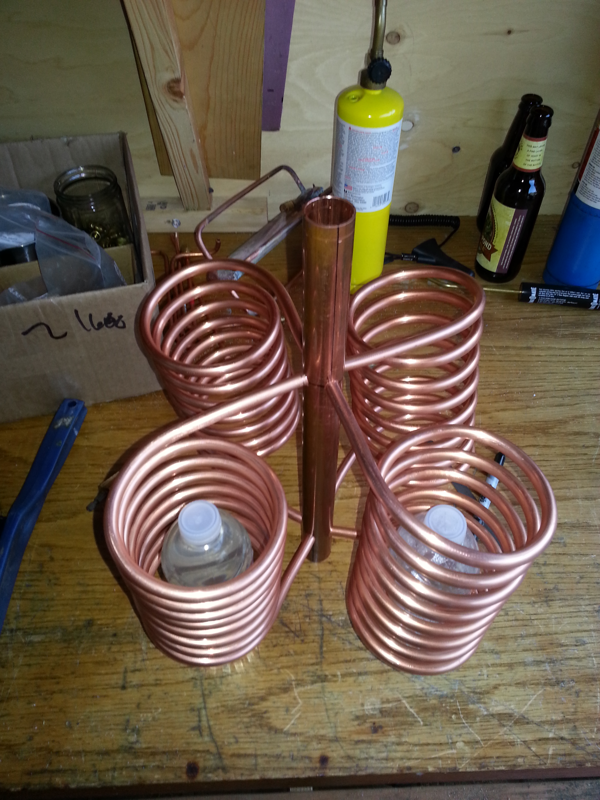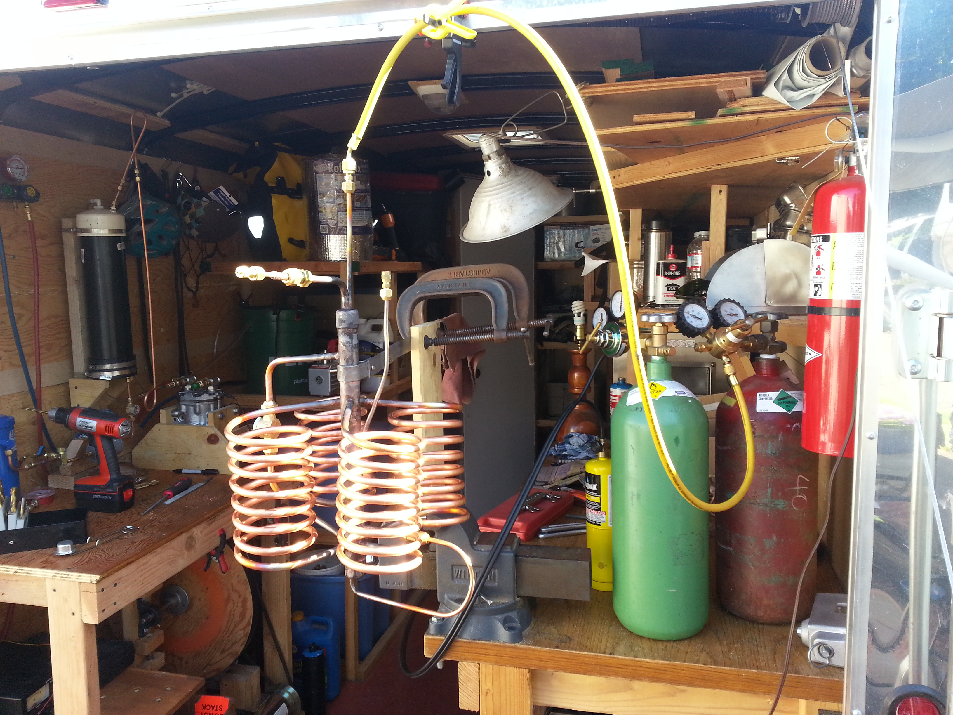 The whole setup after brazing was completed. I purge with dry nitrogen to ensure oxidation does not occur inside the Ebullator. I braze with oxygen and either MAPP gas or propane. This brazing job was the vast majority of any copper brazing I’ve ever done. It wasn’t easy, and by the end of it I felt more confident than when I began. I was delighted to find it held pressure without any detectable soap bubbles!