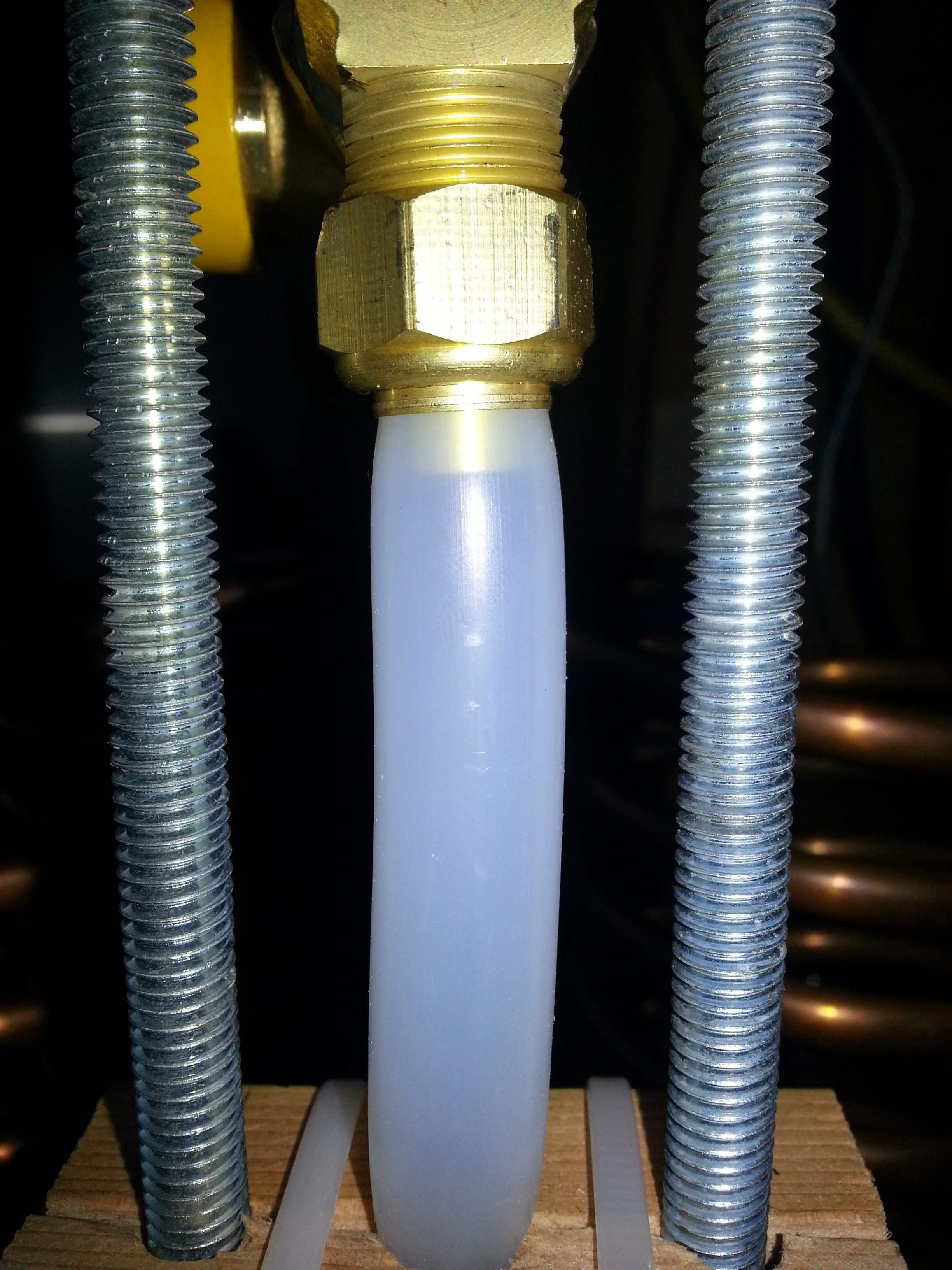The extended view sight glass was made with a piece of 1/2″ OD polyethylene tubing, sealed with compression fittings. Initially, it was a great success, allowing me to understand how the liquid level changed in the separator column under various system conditions. I found that over the course of 12 hours or so, the continuous pressure exerted by propane under ambient saturated conditions, caused the tubing to swell into the shape you see above. I removed the charge in the system as a precaution, and sought out a higher working pressure tubing. I ended up with some nylon tubing with a 250 psi working pressure, as opposed to 100 psi for the PE. The nylon is a little harder to see through, but has yet to swell like this.